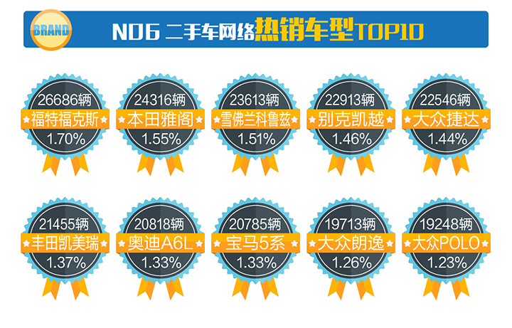 2017年10月二手車網絡熱門緊湊型車TOP10依次是:福特福克斯、雪佛蘭科魯茲、別克凱越、大眾捷達、大眾朗逸、大眾寶來、大眾速騰、豐田卡羅拉、大眾高爾夫、別克英朗。本月榜單中新增大眾高爾夫,取代日產軒逸。其中大眾家族攜帶5款車型進入榜單,占榜單一半。別克2款,雪佛蘭1款,福特1款,豐田1款。10款熱門緊湊型車源總量193652,占總車源12.33%。
