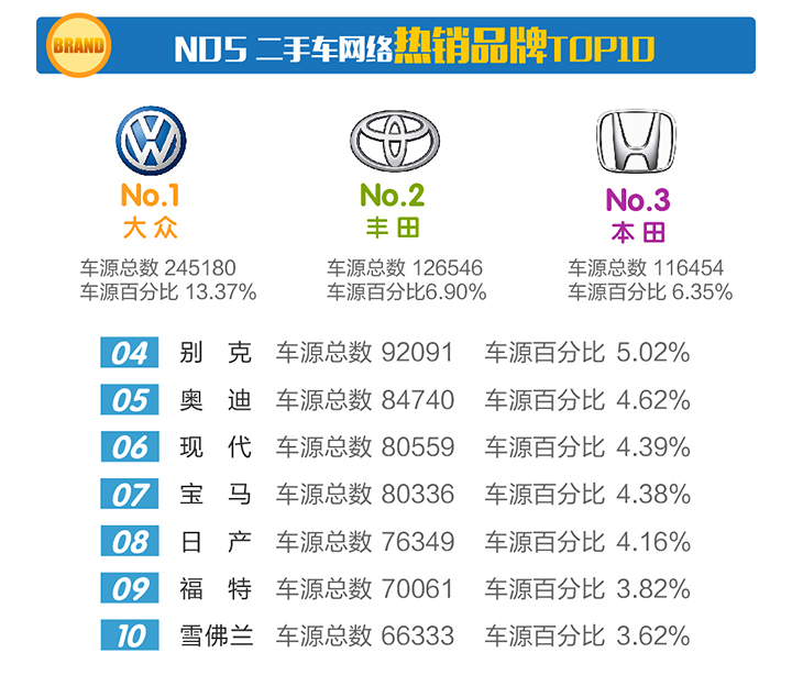 2017年11月熱銷品牌TOP10依次是:大眾、豐田、本田、別克、奧迪、現(xiàn)代、寶馬、日產(chǎn)、福特、雪佛蘭,上榜品牌連續(xù)3個(gè)月一致。10個(gè)品牌車源總量1038649輛,占總車源56.63%。