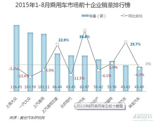 2015年8月乘用車企前十銷量分析:過半銷量下滑