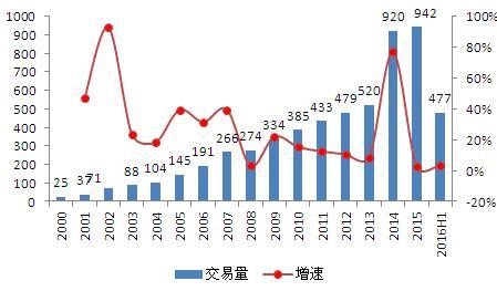 圖表1:2000-2016年中國二手車市場交易數(shù)量分析(單位:萬輛,%)