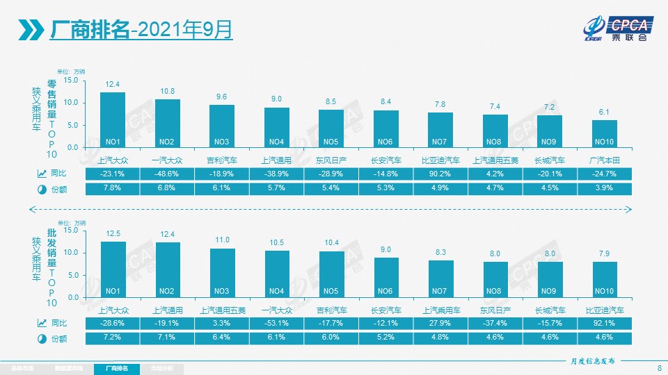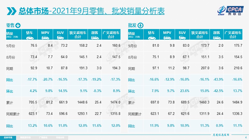 對(duì)1-9月同比增速貢獻(xiàn)了11個(gè)百分點(diǎn)。9月豪華車零售20萬(wàn)輛,同比下降23%,環(huán)比8月增長(zhǎng)0.1%,但相對(duì)2019年9月增長(zhǎng)3%。豪華車?yán)^續(xù)保持結(jié)構(gòu)穩(wěn)定特征,體現(xiàn)消費(fèi)升級(jí)的高端換購(gòu)需求仍舊旺盛,競(jìng)爭(zhēng)影響不大。9月自主品牌零售69萬(wàn)輛,同比增長(zhǎng)5%,環(huán)比8月增長(zhǎng)16%,相對(duì)2019年9月增長(zhǎng)6%。自主品牌國(guó)內(nèi)零售份額為44.3%,同比增9.4個(gè)百分點(diǎn)。批發(fā)市場(chǎng)份額47.7%,較同期份額增長(zhǎng)11個(gè)百分點(diǎn)。且自主品牌頭部企業(yè)產(chǎn)業(yè)鏈韌性強(qiáng)、有效化解芯片短缺壓力,變不利為有利,在新能源獲得明顯增量,因此比亞迪、上汽乘用車等傳統(tǒng)車企品牌同比均呈高幅增長(zhǎng)。9月主流合資品牌零售69萬(wàn)輛,同比下降31%,環(huán)比8月增長(zhǎng)6%,相對(duì)2019年9月下降26%。9月的日系品牌零售份額20.8%,同比下降3.8個(gè)百分點(diǎn)。美系市場(chǎng)零售份額達(dá)到11.3%,同比增長(zhǎng)1.3個(gè)百分點(diǎn),表現(xiàn)較好。德系品牌受制于供給巨大缺口仍處于調(diào)整蓄勢(shì)的階段。出口:9月乘聯(lián)會(huì)乘用車出口(含整車與CKD) 12.8萬(wàn)輛,同比增長(zhǎng)78%,新能源車占出口總量的13%。其中自主品牌出口達(dá)到9.3萬(wàn)輛,同比增長(zhǎng)57%,展現(xiàn)了中國(guó)制造體系競(jìng)爭(zhēng)力從品質(zhì)到規(guī)模均有持續(xù)提升的勢(shì)頭。合資品牌出口1.6萬(wàn)輛,同比增長(zhǎng)259%。生產(chǎn):9月乘用車生產(chǎn)172.1萬(wàn)輛,同比下降14.8%,環(huán)比8月增長(zhǎng)16.1%,走勢(shì)改善。其中豪華品牌生產(chǎn)同比下降17%,合資品牌生產(chǎn)下降31%,自主品牌生產(chǎn)增長(zhǎng)8%。1-9月累計(jì)生產(chǎn)1430.0萬(wàn)輛,同比增長(zhǎng)11.4%。近期海外疫情導(dǎo)致芯片短缺影響生產(chǎn)節(jié)奏,但9月末有所改善。自主品牌傳統(tǒng)車企和新能源車企強(qiáng)化供應(yīng)鏈優(yōu)勢(shì),有效化解芯片短缺壓力,取得9月環(huán)比8月生產(chǎn)增長(zhǎng)的良好表現(xiàn)。批發(fā):9月廠商批發(fā)銷量173.7萬(wàn)輛,環(huán)比增15.0%,同比下降16.1%,較19年9月下降9%。1-9月累計(jì)批發(fā)銷量1460.3萬(wàn)輛,同比增長(zhǎng)11.3%,但較2019年同期減少40.2萬(wàn)輛。庫(kù)存:今年去庫(kù)存明顯,近幾個(gè)月廠商庫(kù)存持續(xù)保持低位。9月末廠商庫(kù)存環(huán)比下降2萬(wàn)輛,渠道庫(kù)存環(huán)比增長(zhǎng)3萬(wàn)輛;2021年1-9月廠商庫(kù)存減少29萬(wàn)輛,相較歷年同期庫(kù)存減少幅度偏大,形成連續(xù)四年強(qiáng)力去庫(kù)存的特征。2021年1-9月的渠道庫(kù)存相對(duì)減少84萬(wàn)輛,較2020年同期去庫(kù)存22萬(wàn)輛水平又有大幅升高,上游生產(chǎn)端短期內(nèi)芯片短缺影響整車生產(chǎn)節(jié)奏的問(wèn)題逐步顯現(xiàn)。在終端銷售層面,伴隨庫(kù)存水平的大幅降低,出現(xiàn)部分暢銷車型無(wú)車可提、折扣回收、銷售政策考核指標(biāo)趨于寬松化等的現(xiàn)象。部分合資企業(yè)損失大量訂單并導(dǎo)致士氣受損,同時(shí)也給自主和新能源企業(yè)留出了窗口期。9月購(gòu)車接送孩子上下學(xué)等家庭第二輛車、暑假學(xué)車潮向后推導(dǎo)的本地大學(xué)新生練手車、職場(chǎng)新人入門(mén)級(jí)代步車的需求更強(qiáng)烈,導(dǎo)致經(jīng)濟(jì)型電動(dòng)車市場(chǎng)趨勢(shì)出人意料地走強(qiáng)。新能源:9月新能源乘用車批發(fā)銷量達(dá)到35.5萬(wàn)輛,環(huán)比增長(zhǎng)14.7%,同比增長(zhǎng)184.4%。1-9月新能源乘用車批發(fā)202.3萬(wàn)輛,同比增長(zhǎng)218.9%。9月新能源乘用車零售銷量達(dá)到33.4萬(wàn)輛,同比增長(zhǎng)202.1%,環(huán)比增33.2%。1-9月新能源車零售181.8萬(wàn)輛,同比增長(zhǎng)203.1%。與傳統(tǒng)燃油車走勢(shì)形成強(qiáng)烈差異化的特征,實(shí)現(xiàn)對(duì)燃油車市場(chǎng)的替代效應(yīng),并拉動(dòng)車市向新能源化轉(zhuǎn)型的步伐。1) 批發(fā):9月新能源車廠商批發(fā)滲透率20.4%,1-9月滲透率13.7%,較2020年5.8%的滲透率提升明顯。9月,自主品牌中的新能源車滲透率33%;豪華車中的新能源車滲透率30.5%;而主流合資品牌中的新能源車滲透率僅有3.0%。9月純電動(dòng)的批發(fā)銷量29.8萬(wàn)輛,同比增長(zhǎng)192.4%;插電混動(dòng)銷量5.7萬(wàn)輛,同比增長(zhǎng)149.0%,占比16%。9月電動(dòng)車高端車型銷量強(qiáng)勢(shì)增長(zhǎng),中低端走勢(shì)改善。9月電動(dòng)車高端車型銷量強(qiáng)勢(shì)增長(zhǎng),中低端走勢(shì)較強(qiáng)。其中A00級(jí)批發(fā)銷量9.0萬(wàn),份額達(dá)到純電動(dòng)的30%;A級(jí)電動(dòng)車占純電動(dòng)份額24%,保持相對(duì)穩(wěn)定;B級(jí)電動(dòng)車達(dá)8.6萬(wàn)輛,環(huán)比8月增29%,占純電動(dòng)份額29%。2) 零售:9月新能源車國(guó)內(nèi)零售滲透率21.1%,1-9月滲透率12.6%,較2020年5.8%的滲透率提升明顯。9月,自主品牌中的新能源車滲透率36.1%;豪華車中的新能源車滲透率29.2%;而主流合資品牌中的新能源車滲透率僅有3.5%。3) 出口:9月新能源車出口1.48萬(wàn)輛,呈現(xiàn)季末平穩(wěn)走勢(shì)。其中超過(guò)千輛的有東風(fēng)易捷特的5164輛,上汽乘用車的新能源出口4560輛,特斯拉中