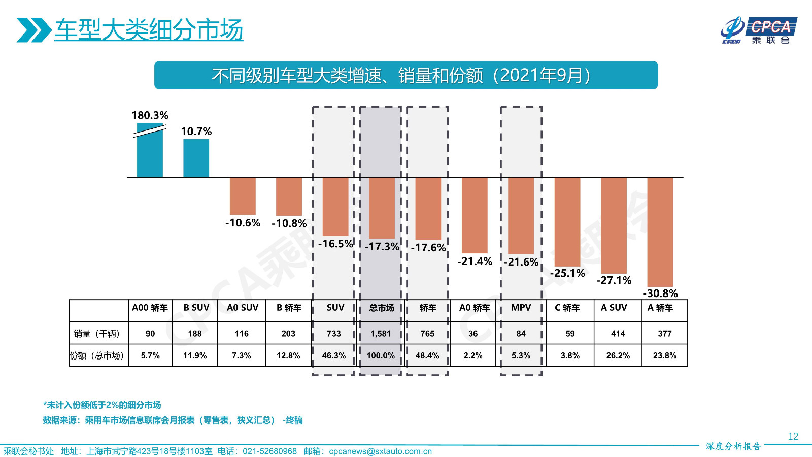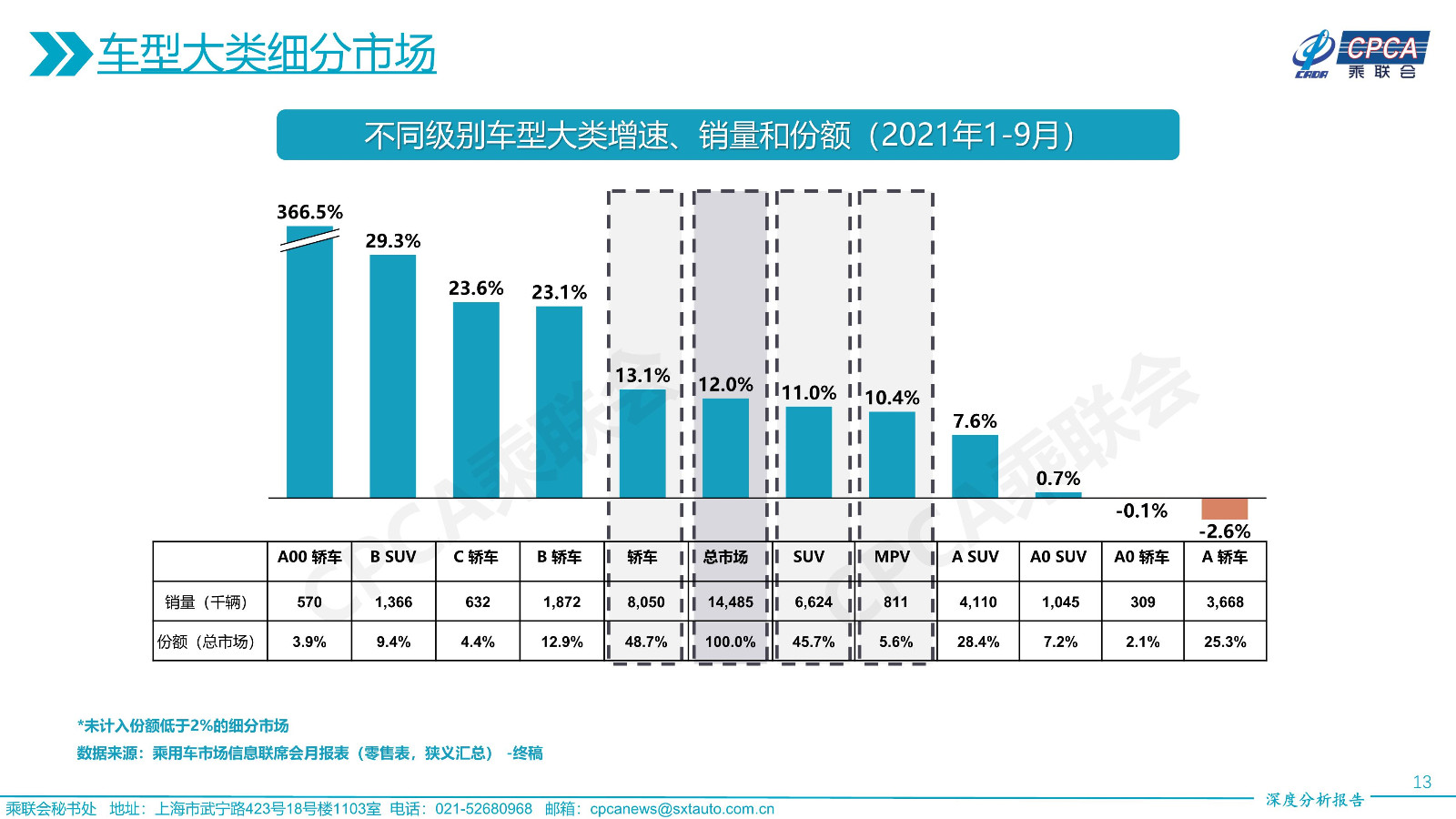 不同級(jí)別車型大類增速、銷量和份額——2021年9月及累計(jì)