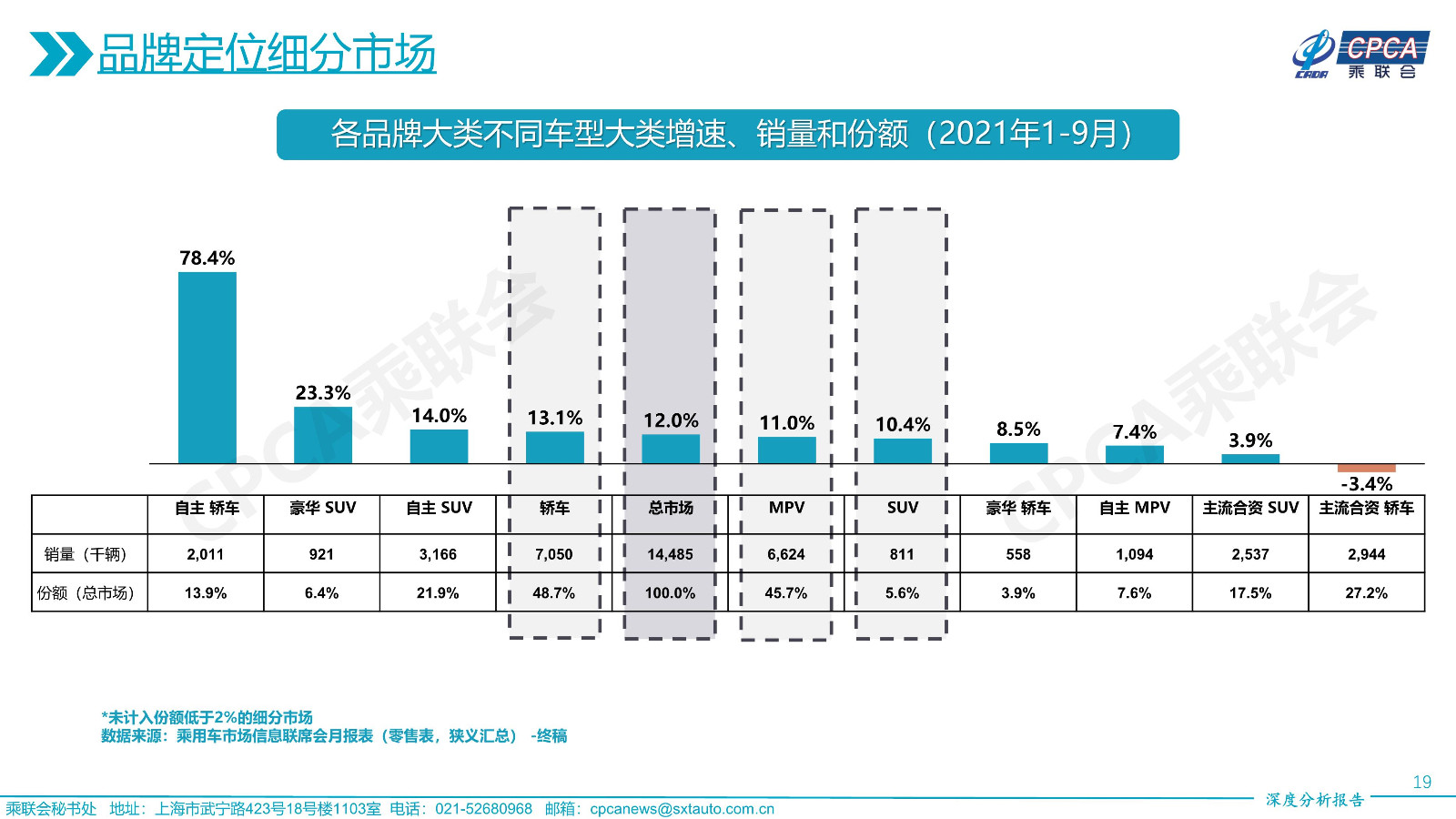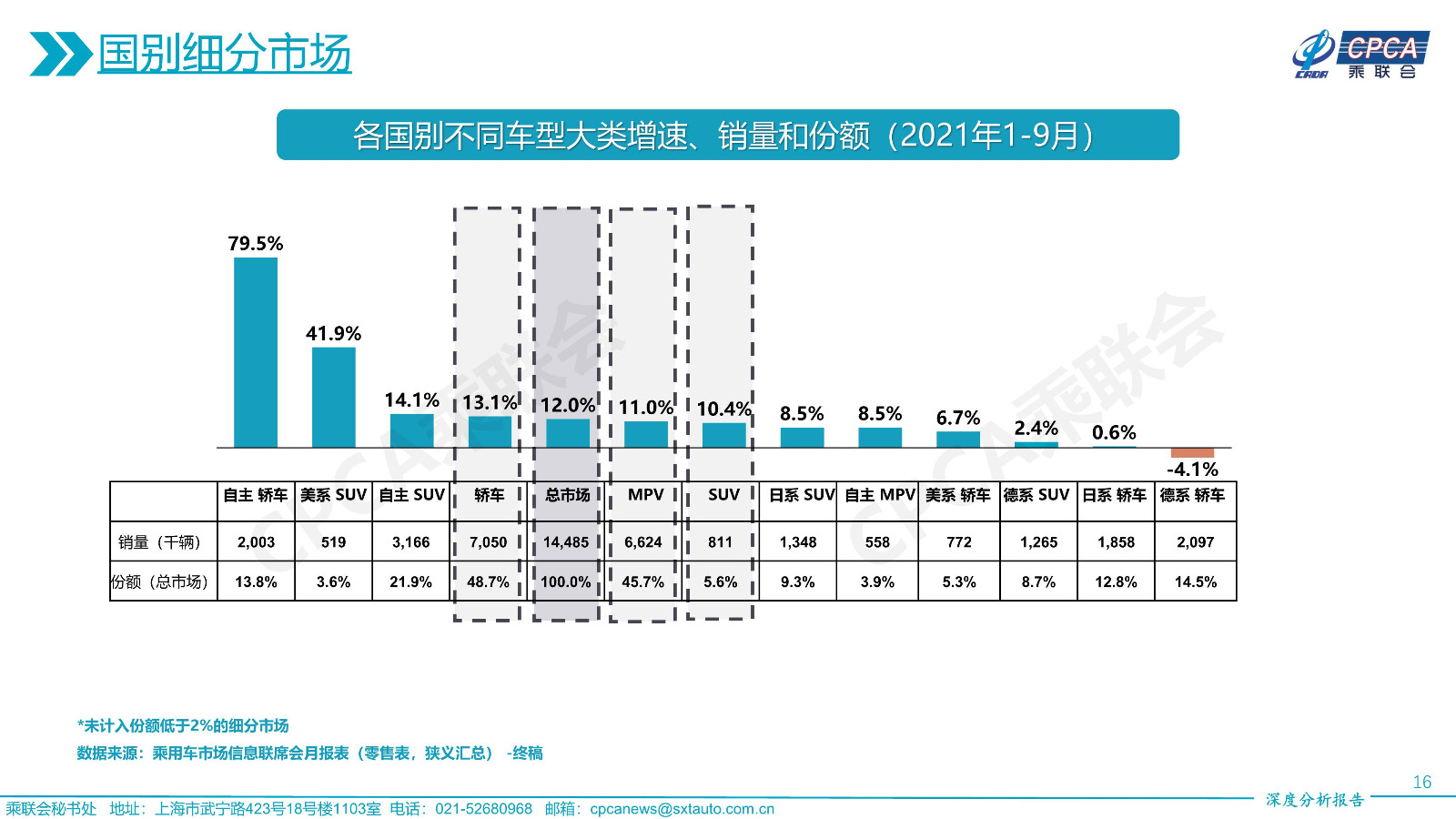 各品牌大類下不同車型大類增速、銷量和份額——2021年9月及累計(jì)