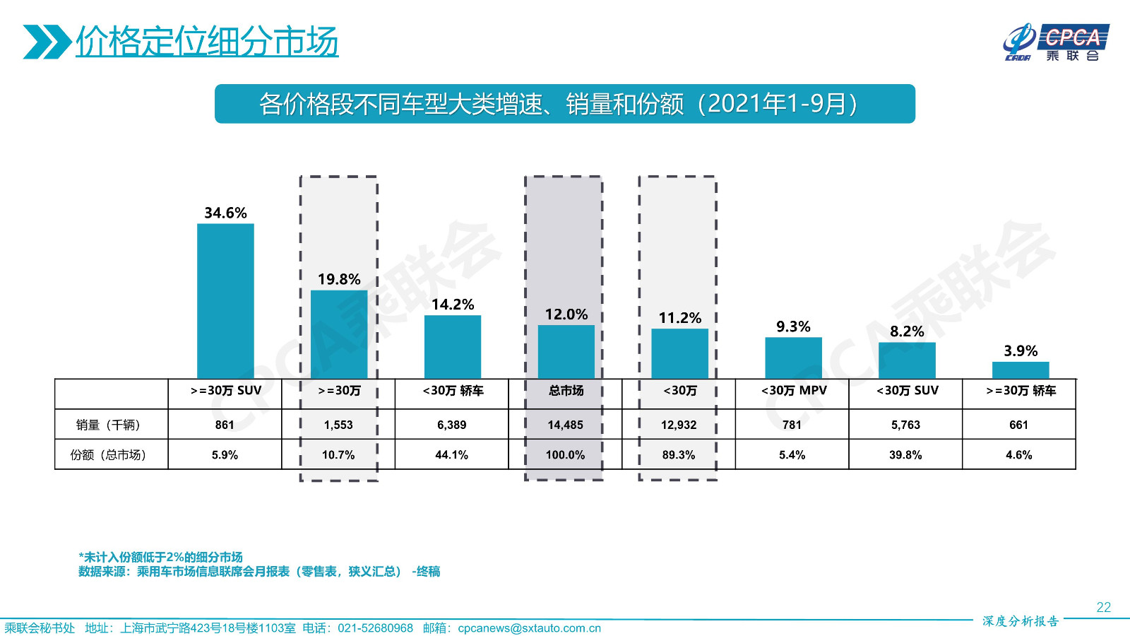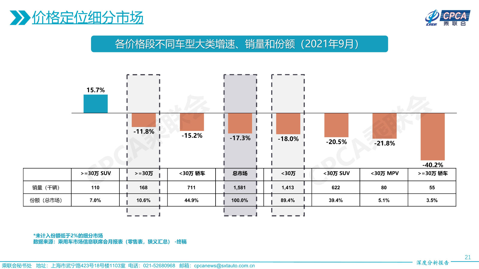 各價(jià)格段不同車型大類增速、銷量和份額——2021年9月及累計(jì)