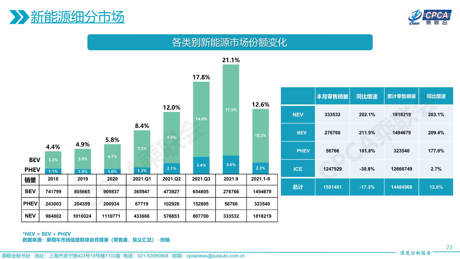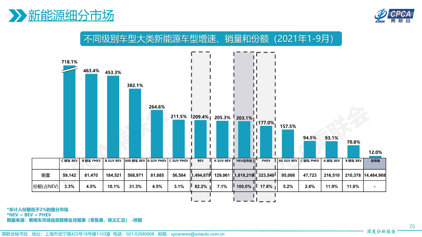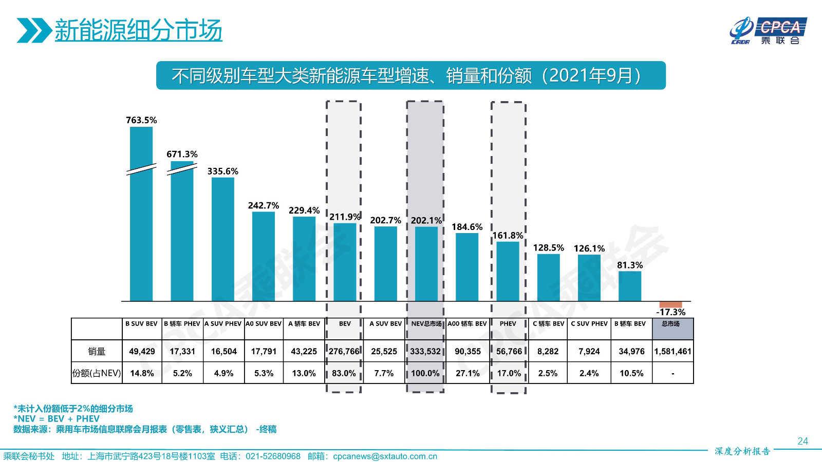 不同級(jí)別車型大類新能源車型增速、銷量和份額——2021年9月及累計(jì)