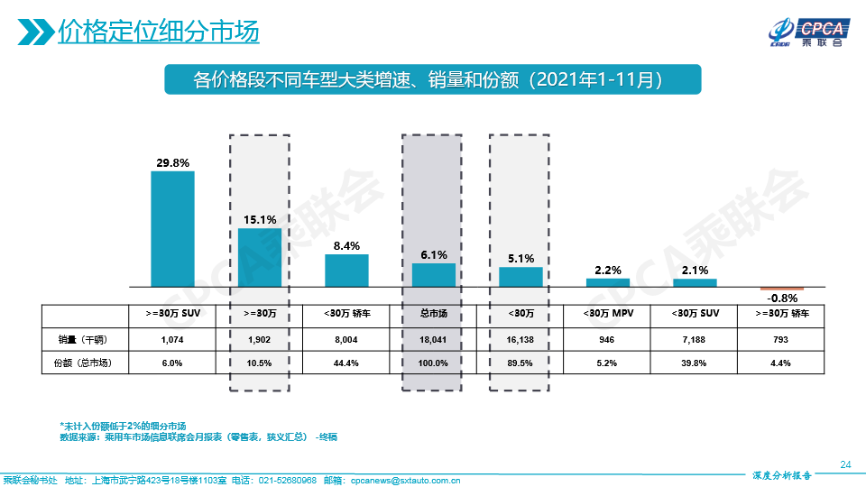(含各價(jià)格段市場份額變化及各價(jià)格段不同車型大類增速、銷量和份額——2021年11月及累計(jì))