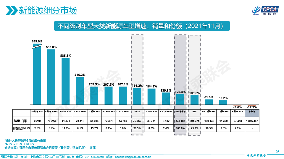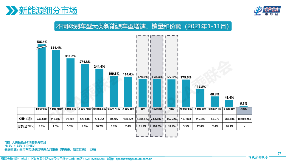 (含各類別新能源市場份額變化及不同級別車型大類新能源車型增速、銷量和份額——2021年11月及累計(jì))
